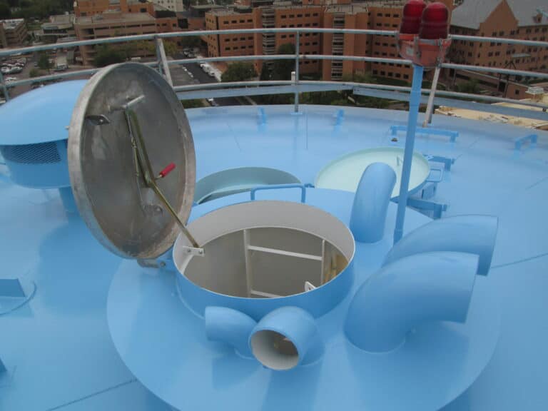 HR Green helped the operations team implement one of the projects with the Flow Control Valve Vaults, which regulate the flow from the high-pressure zone to the central pressure zone. The construction process required full containment of the tower during sandblasting and coating to protect the surrounding neighborhood, park, and hospital parking lots. The elevated water tower refurbishing consisted of the exterior coated with a high-performance fluoropolymer coating, and the interior wet was coated with a high solids, high mil build, and epoxy coating to provide a long-lasting coating system.