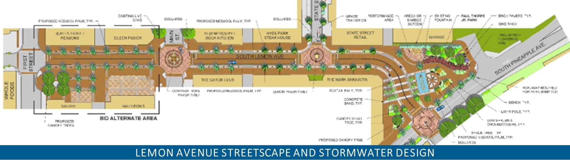 The goal of the City of Sarasota was to transform a high-profile downtown corridor—Lemon Avenue between Ringling Boulevard and Main Street—into a pedestrian-friendly streetscape that could double as a flexible event space. With strict timeframes to minimize disturbance to surrounding businesses and the recently built Mark Hotel, the project required significant stormwater system upgrades to address collection and conveyance needs. The scope included complete road rebuilding, expanded sidewalks, hardscape and landscaping, improved lighting, and the expansion of Paul Thorpe Jr. Park.