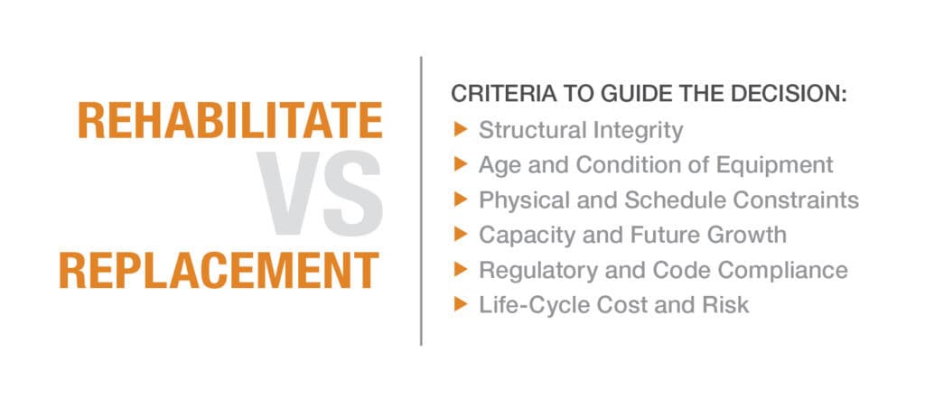 When pumps, valves, and electrical systems have exceeded their life expectancy or are no longer supported by manufacturers, replacement may offer more long-term value. However, if these components can be selectively upgraded, rehabilitation can deliver strong results at lower cost.